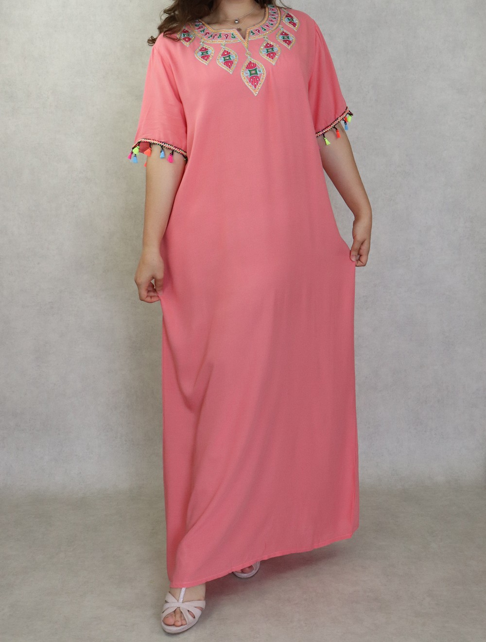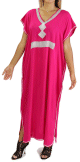 Découvrez cette belle robe et craquez pour ses jolis strass et ses motifs berbères, col rond semi ouvert, manches courtes avec des pompons multi-couleur. La coupe de cette gandoura ainsi que sa matière faciliteront une décontraction évidente.