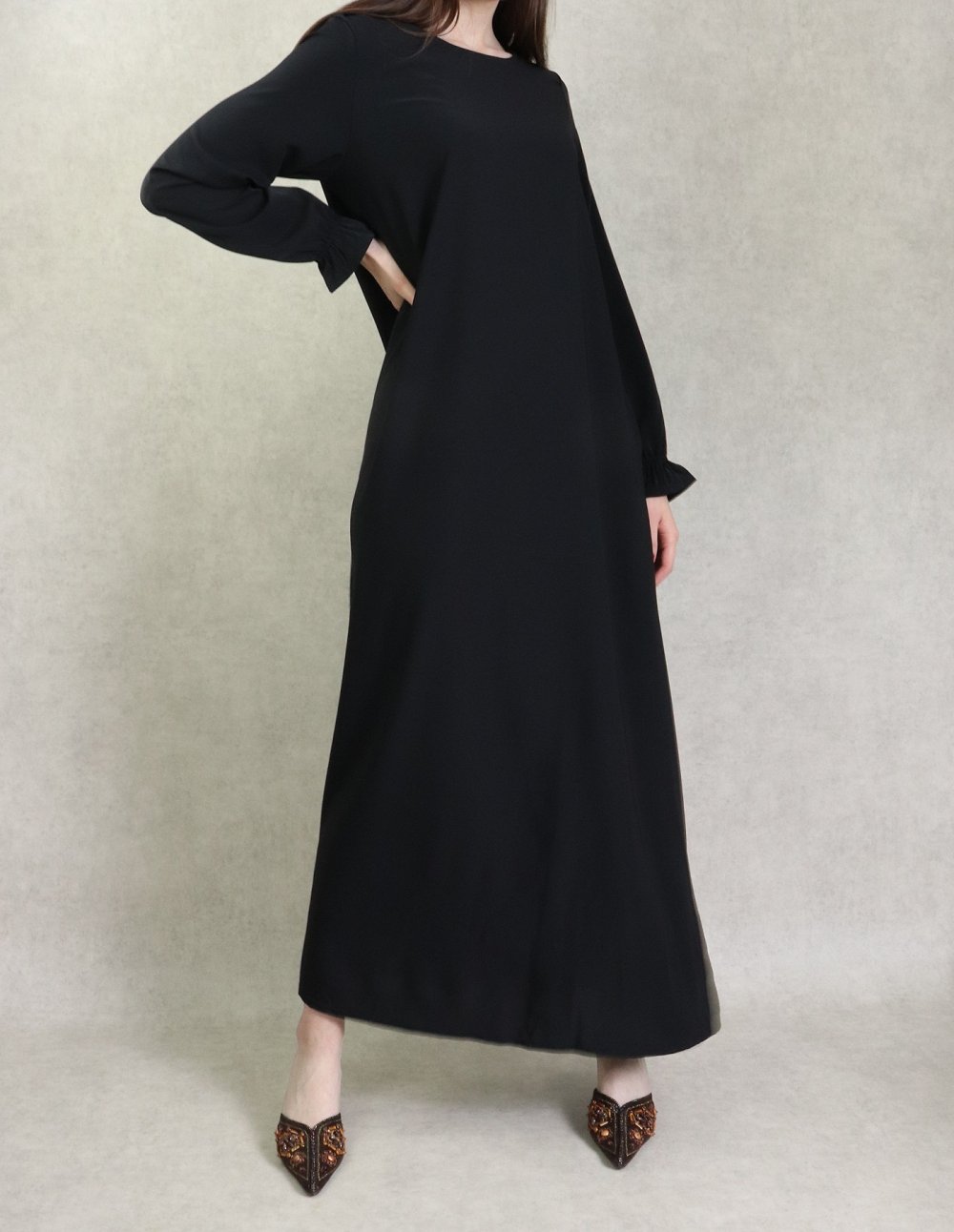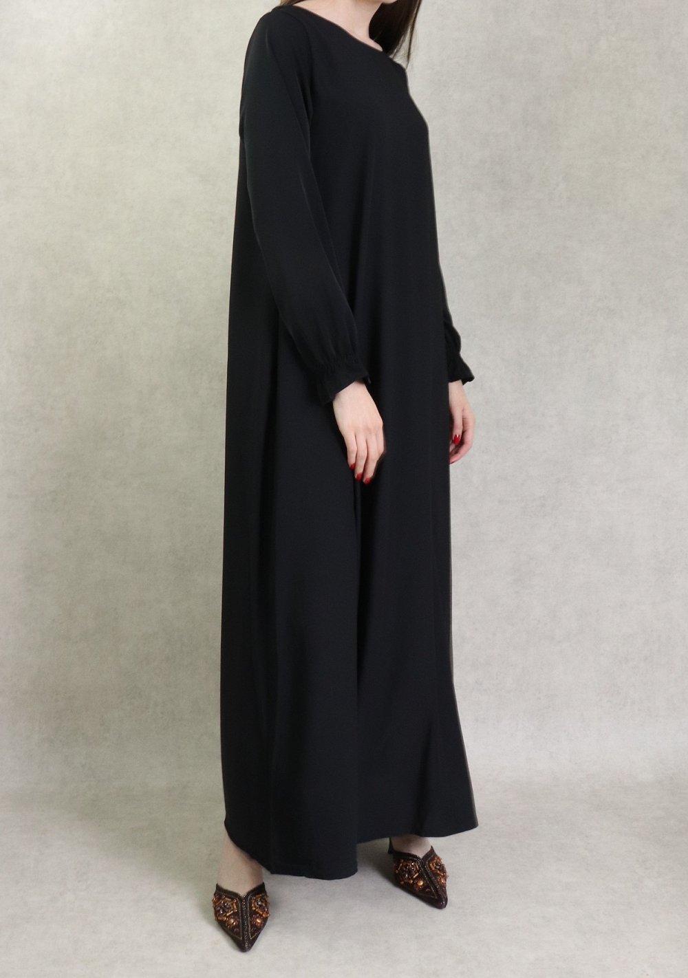 Jolie robe Abaya longue, col rond, coupe évasée, deux poches latérales, tissu nidah noir opaque. Beau tombé et très agréable à porter. Intemporel, il se porte en toutes saisons, en toutes occasions.