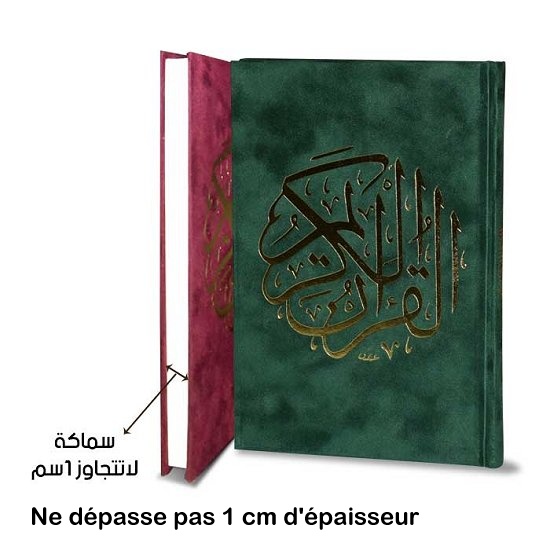 Le Coran en langue arabe lecture Hafs imprimé sur du papier de Médine de très haute qualité (Ne dépasse pas 1 cm d'épaisseur). Couverture rigide de luxe recouverte de daim avec dorure et marque page en soie intégré.
