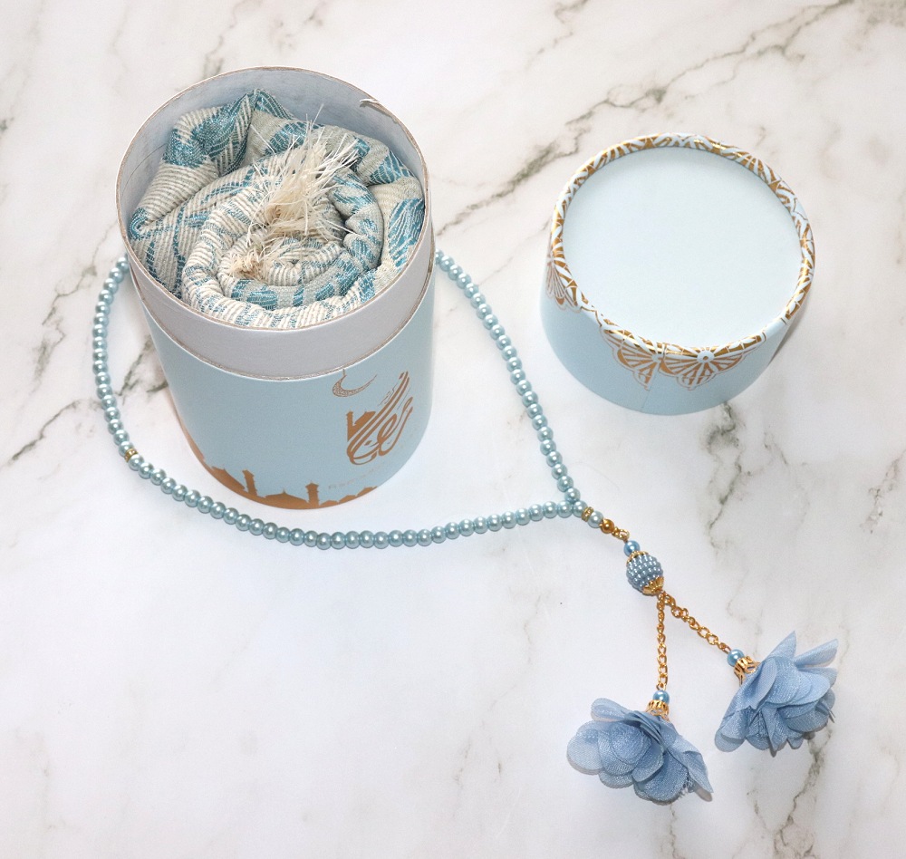 Coffret Cadeau "Ramadan Kareem" : Boite cadeau avec Tapis et Sebha deluxe assorti - Couleur Bleu ciel doré Deco & Cadeau
