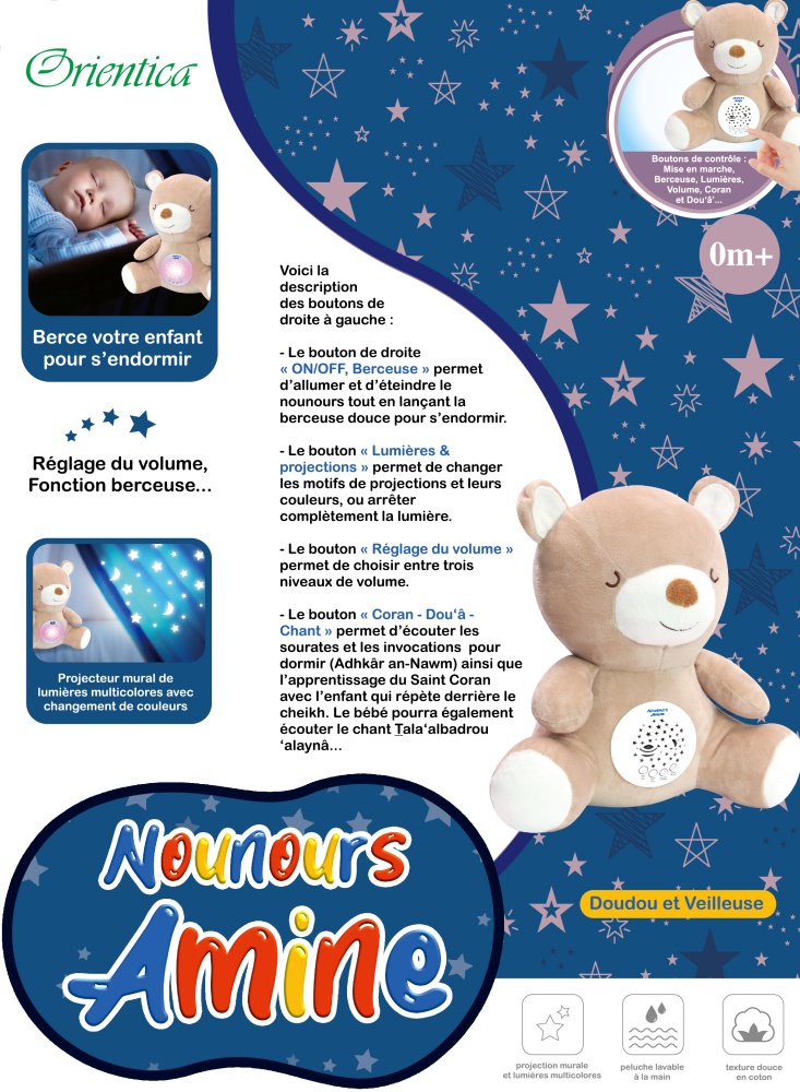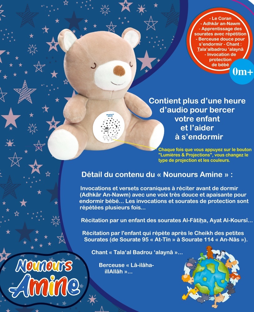 La peluche parlante (doudou) "Nounours Amine" contient plus d’une heure d’audio pour bercer votre enfant et l’aider à s’endormir : Le Coran - Adhkâr an-Nawm - Apprentissage des sourates avec répétition - Berceuse douce pour s’endormir - Chant  Tala‘albadrou ‘alaynâ - Invocation de protection de bébé...