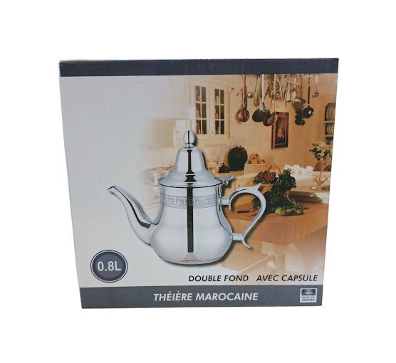 Jolie théière de style marocain traditionnel chromée de taille Moyenne avec des arabesques gravées sur le flanc. Capacité : 0.80 L.