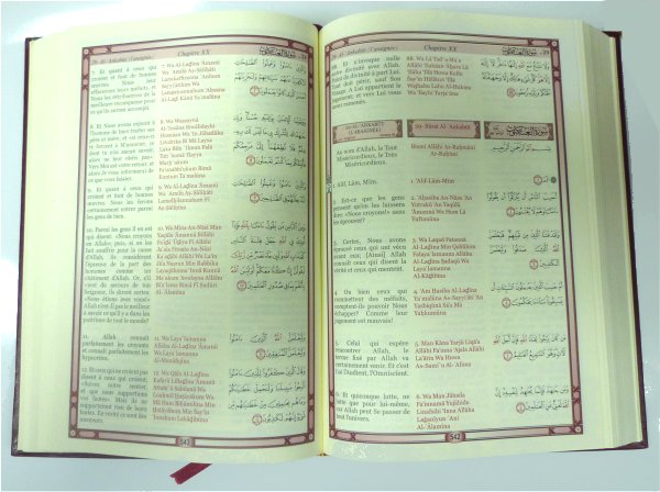 Le Saint Coran en livre contient la traduction en langue française du sens de ses versets et la transcription phonétique en plus de l'arabe.