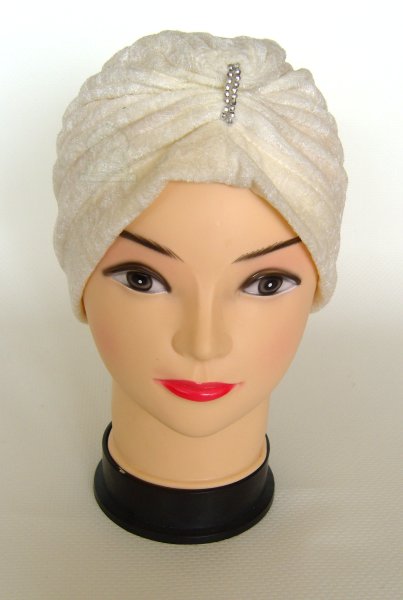 Un bonnet en velours de couleur blanc cassé orné de petites perles argentées au milieu.
