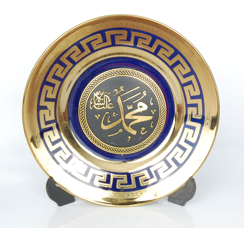 Assiette décorative bleue avec la calligraphie "Mohammed (SAW)" décorée de jolis motifs dorés...