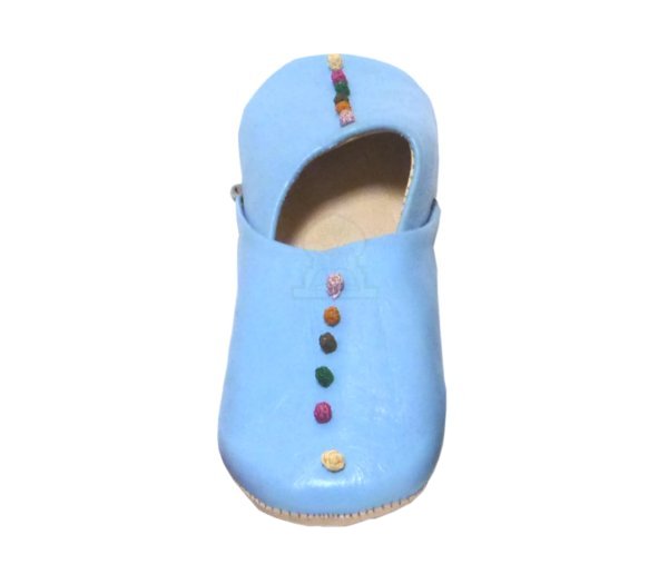 Babouche traditionnelle marocaine en cuir de couleur violette pour femmes. Ces babouches possèdent un bout - une extrémité - arrondi (e), pour plus de confort à l'intérieur. Elles sont décorées de jolis nœuds en Sabra multi-couleurs...