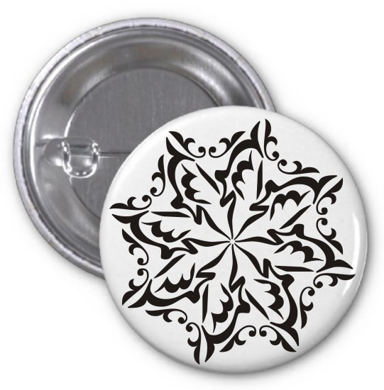 Badge avec calligraphie artistique arabe "Al-Hamdulillâh" répétée plusieurs fois.