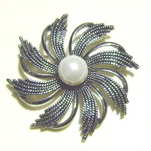 Broche en forme de fleur argentée ornée d'une perle blanche au milieu.