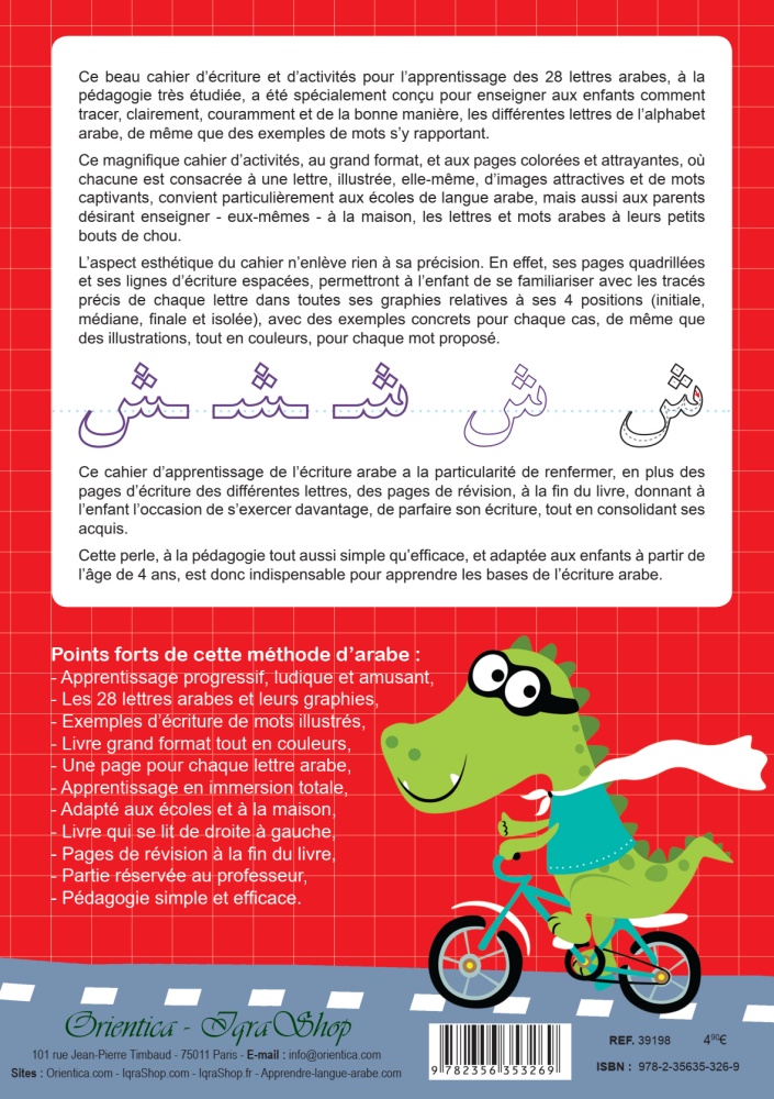 Ce magnifique cahier d’activités, au grand format, et aux pages colorées et attrayantes, où chacune est consacrée à une lettre, illustrée, elle-même, d’images attractives et de mots captivants, convient particulièrement aux écoles de langue arabe, mais aussi aux parents désirant enseigner - eux-mêmes - à la maison, les lettres et mots arabes à leurs petits bouts de chou.