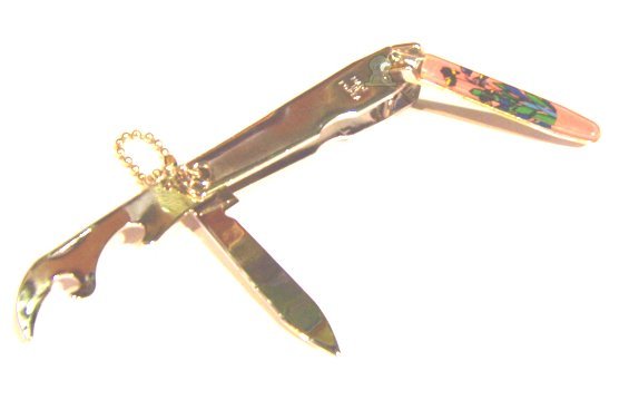 Six fonctions: coupe ongle,chainette porte-clé, couteau, ouvre-boite, décapsuleur et lime.