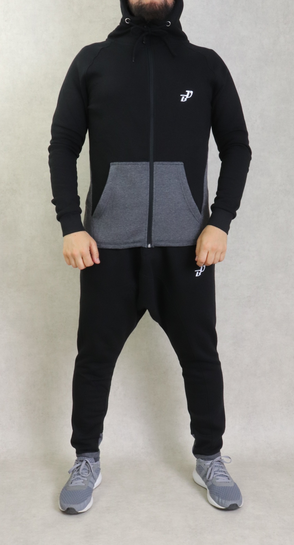 Ensemble constitué d'une veste noire bicolore noire et grise , plus longue à l'arrière qu'à l'avant. Tissu épais molletonné de qualité doux. Deux poches sur les côtés. Capuche doublée avec cordon. Et d'un pantalon seroual assorti noir avec partie grise au niveau des chevilles.