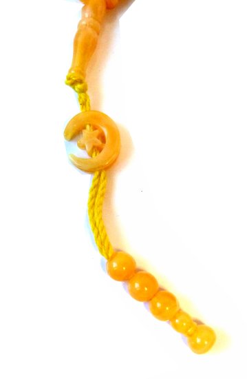 Grande Sebha à 99 grains en plastique de couleur ocre avec à son extimité le croissant musulman.
