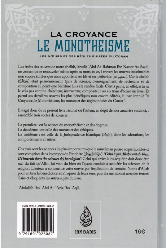 Le fruit des œuvres de notre cheikh, l'érudit Abd Ar-Rahmân Ibn Nasser As-Saadi, ne cesse de se renouveler même après son décès.Ses fils et ses petits-fils nous font découvrir des travaux encore non publiés,car le cheikh était épris de science, d'enseignement, de recherche au point que l'écriture lui a été rendue facile.Parmi ses dernières œuvres il y'a le livre intitulé "la Croyance ,le Monothéisme, les mœurs et des règles puisées du Coran "
