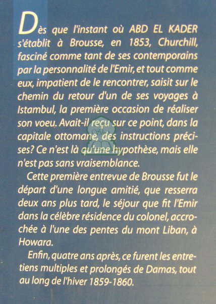 A l’instant où Abdel Kader s’établit à Brousse, en 1853, Churchill, fasciné comme tant de ses contemporains par la personnalité de l’Emir, est impatient de le rencontrer.Il en saisit l'occasion sur le chemin du retour d’un de ses voyages d'Istanbul. Avait-il reçu sur ce point, dans la capital Ottomane des instructions précises ? Ce n’est là qu’une hypothèse, mais elle peut paraitre vraisemblable.
