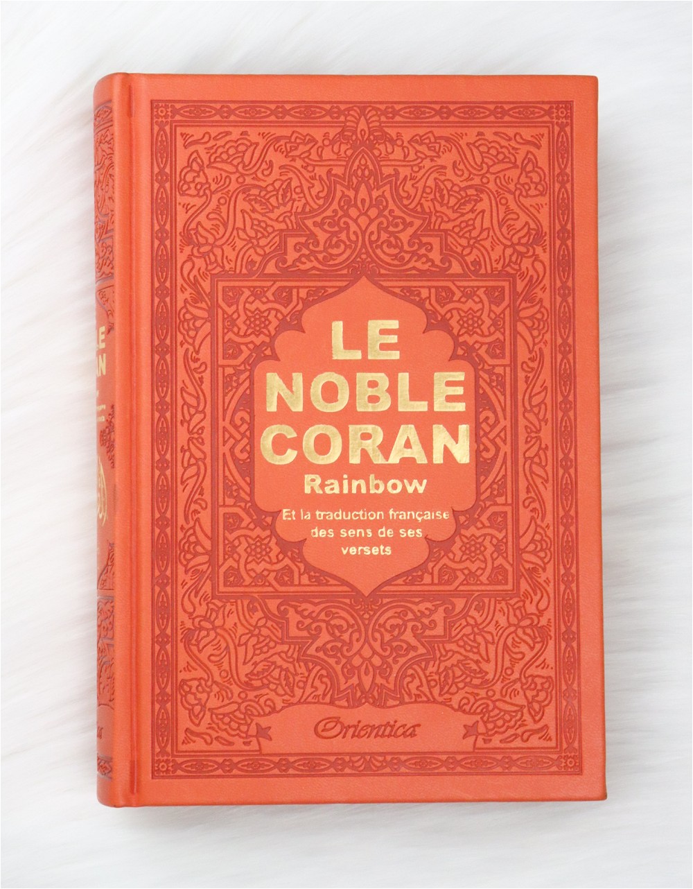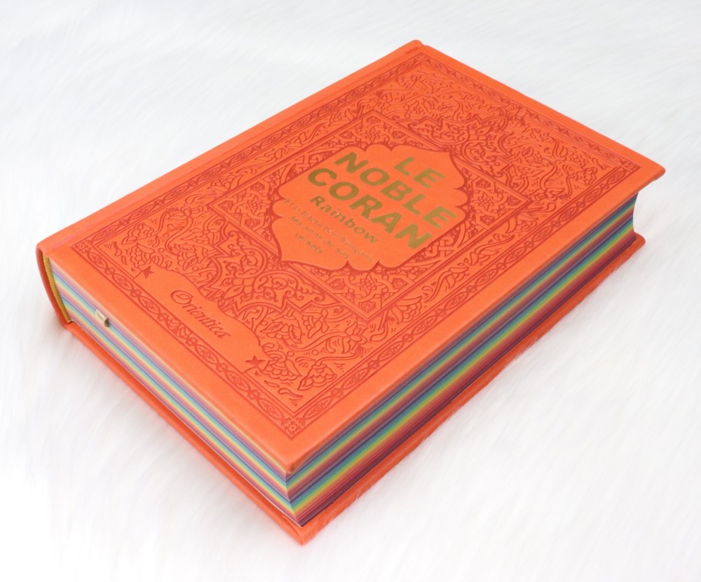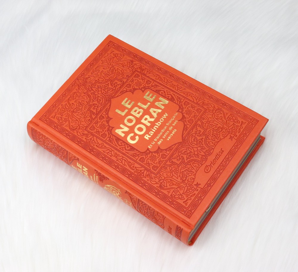 Ce Coran Arc-en-ciel (en anglais "Rainbow Quran") a une couverture cartonnée de type cuir, doux au toucher. Très jolie couleur orange. Idéal pour offrir.