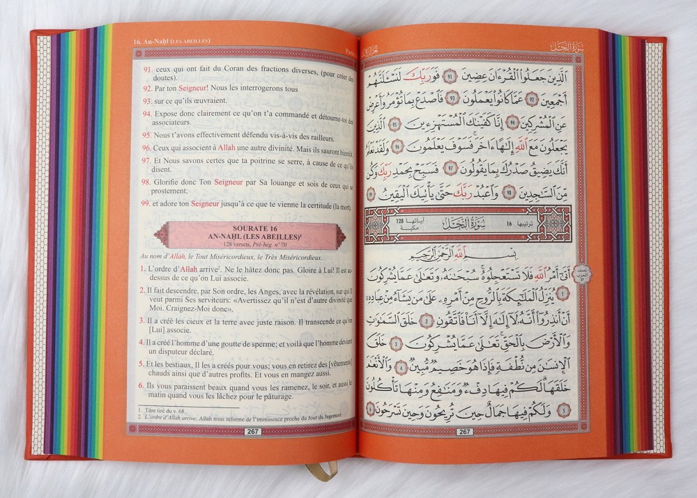 Dans ce magnifique Coran chaque partie (Jouz') est colorée avec une couleur différente, avec un dégradé de couleurs sous forme d'arc-en-ciel. Ce qui aide l'apprentissage et la révision du Saint Coran.