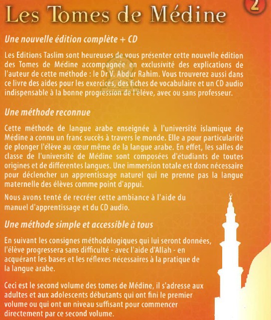 Ce livre est le second volume des tomes de Médine, il s'adresse aux adultes et aux adolescents débutants qui ont fini le premier tome ou qui ont un niveau suffisant pour commencer directement par ce second volume.