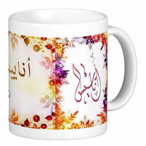 Mug avec le prénom "Anaïs" écrit en français, en arabe (أناييس) et calligraphié de façon artistique en arabe sur la partie droite.