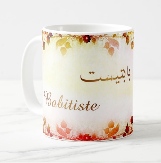 Mug avec le prénom "Babitiste" écrit en français, en arabe (بابتيست) et calligraphié de façon artistique en arabe sur la partie droite.
