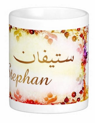Mug avec le prénom "Stephan" écrit en français, en arabe (ستيفان) et calligraphié de façon artistique en arabe sur la partie droite.