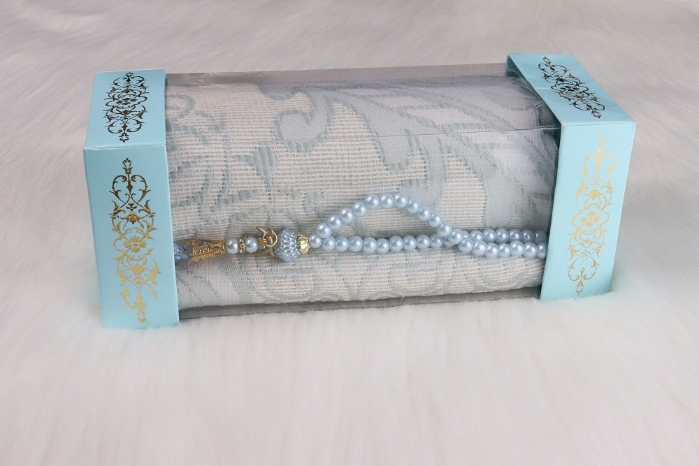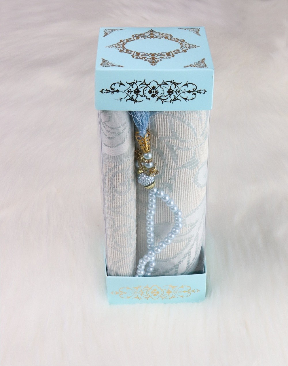 Jolie boite cadeau dorée contenant un tapis brodé (taille adulte) et un chapelet assorti de luxe à 99 perles, avec décorations métalliques.