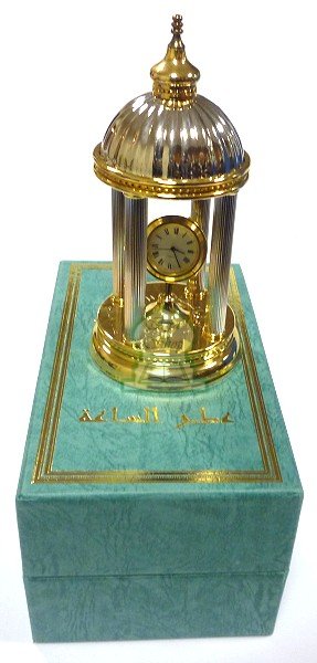 Parfum avec bouteille métallique dorée sous forme d'horloge. Peut servir également d'objet décoratif.