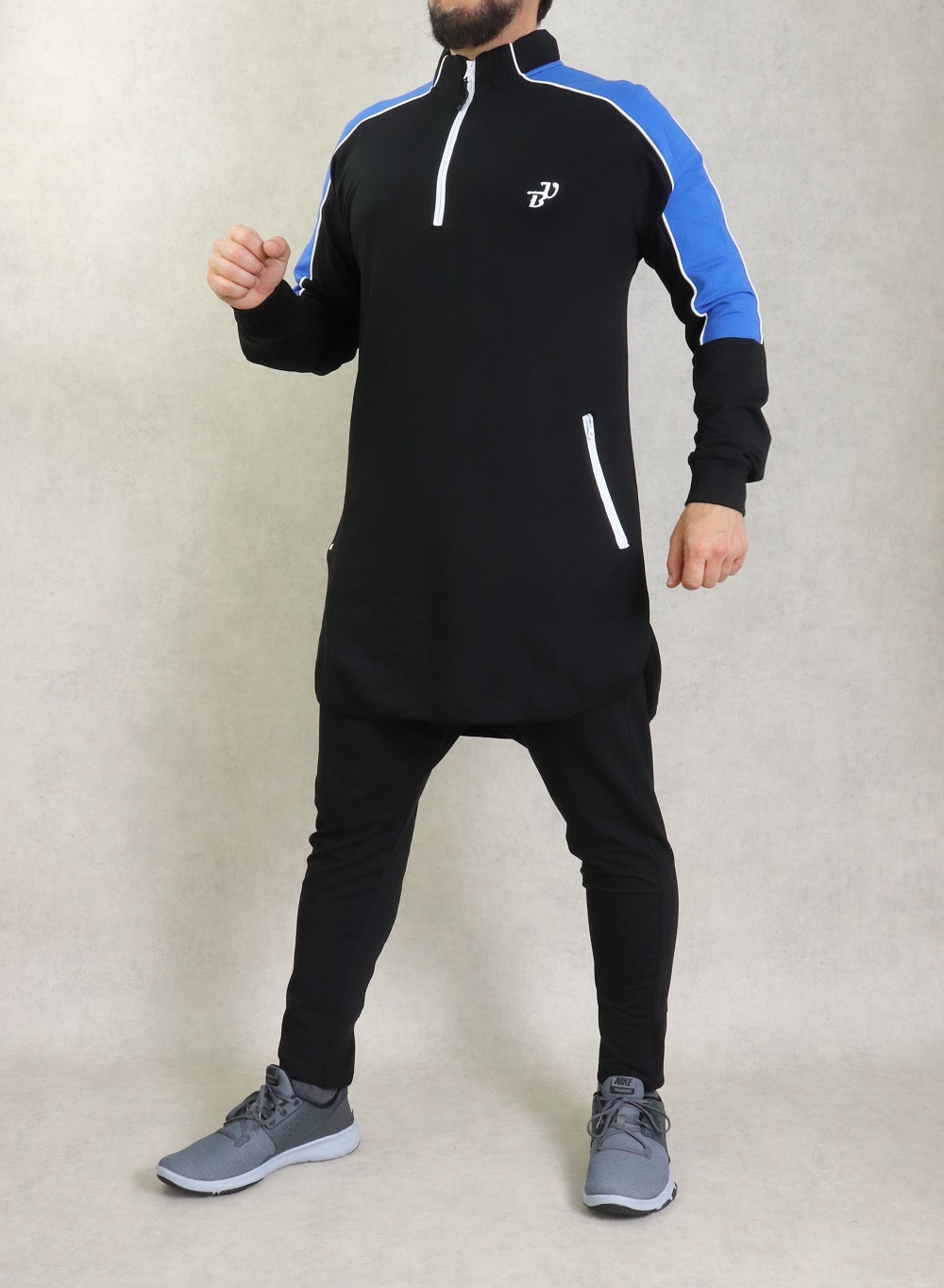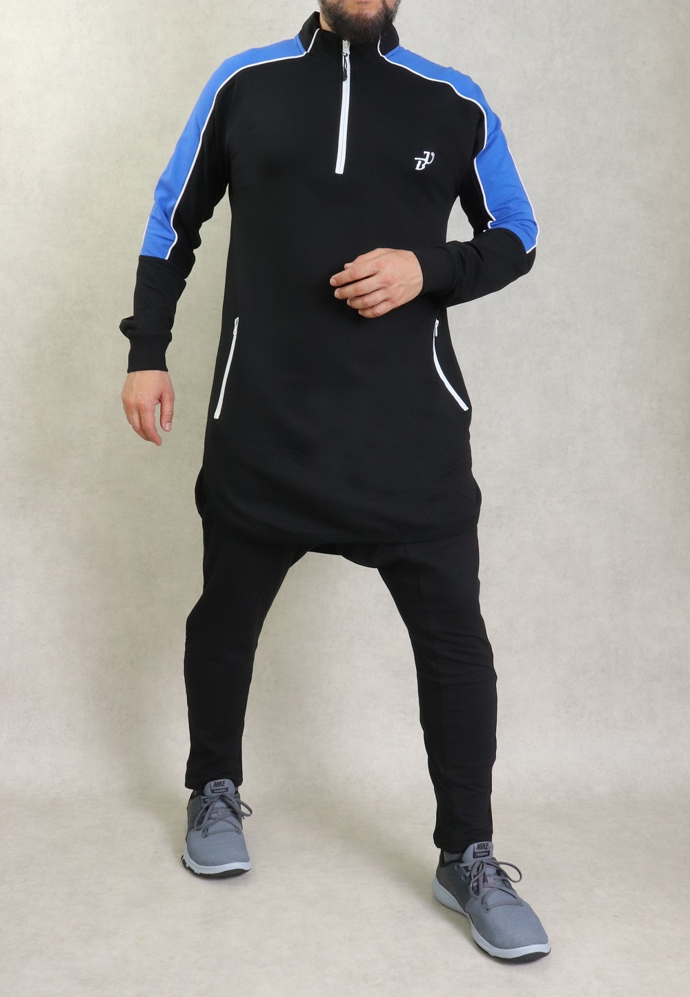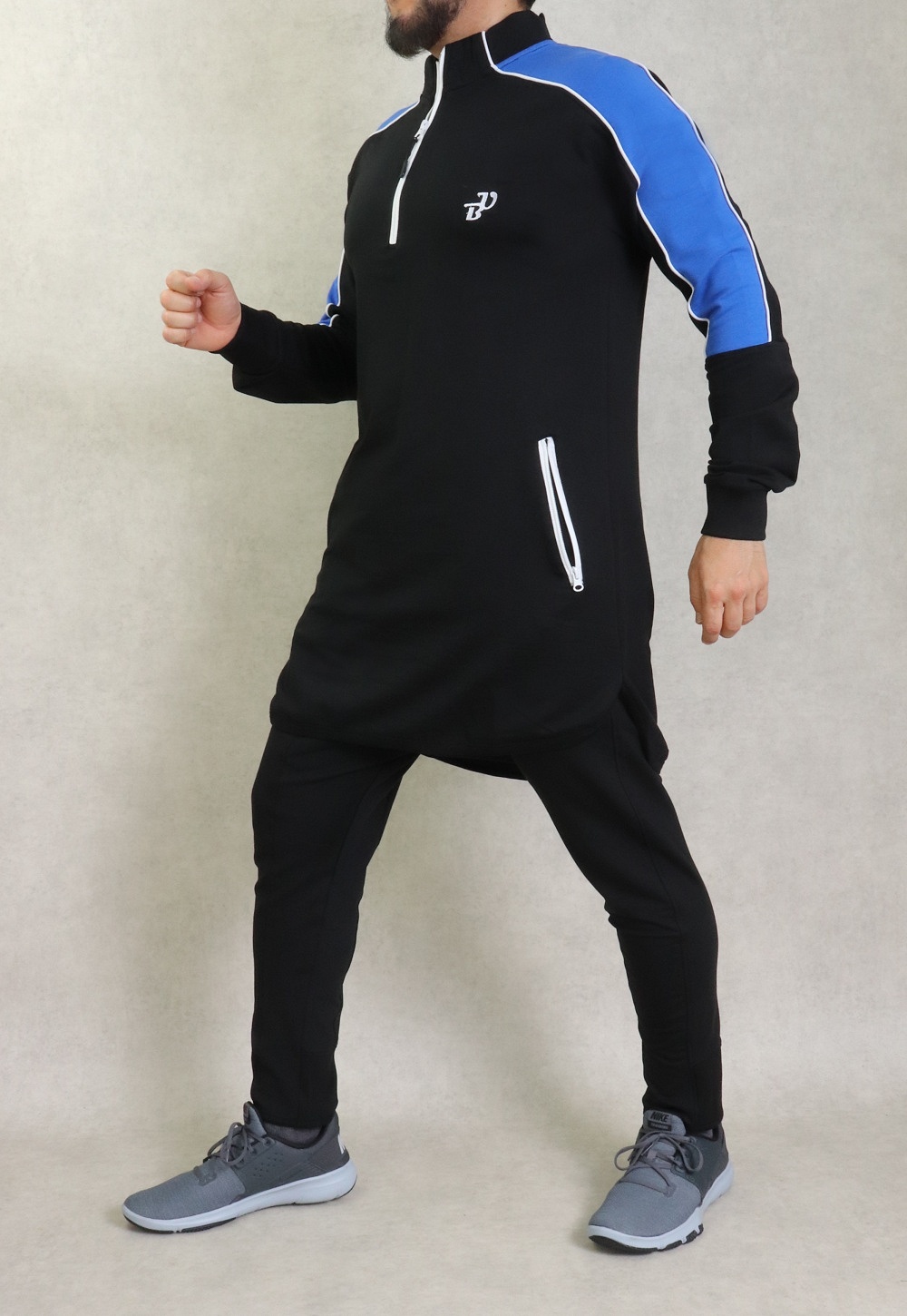 Qamis court bicolore type sportswear. Deux poches latérales zip. Ouverture zip au niveau du cou. Tissu coton léger stretch.