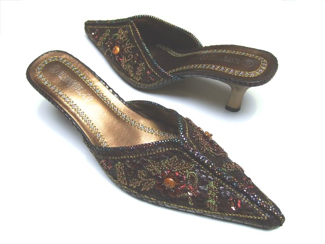 Ces sabots à petit talon, une touche très chic pour les femmes qui ne supportent pas les talons vertigineux, notez la tendance des perles et strass multicolores. Cette très belle paire de mules orientales brunes et brillantes avec perles et broderies, à bout pointu se marient parfaitement avec tous types de robes.