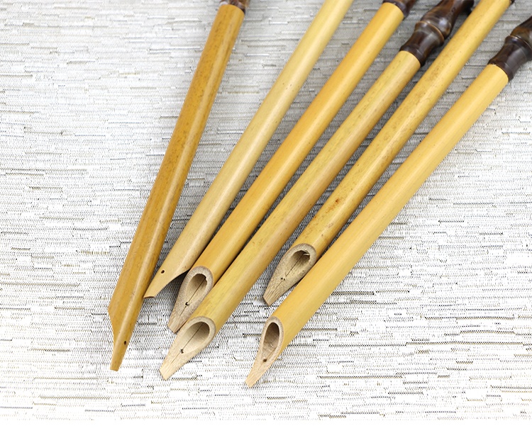 Le calame est taillé dans une variété de bambou jaune, dur et dense. Son tracé net et précis se conjugue avec une excellente résistance à l’usure.
